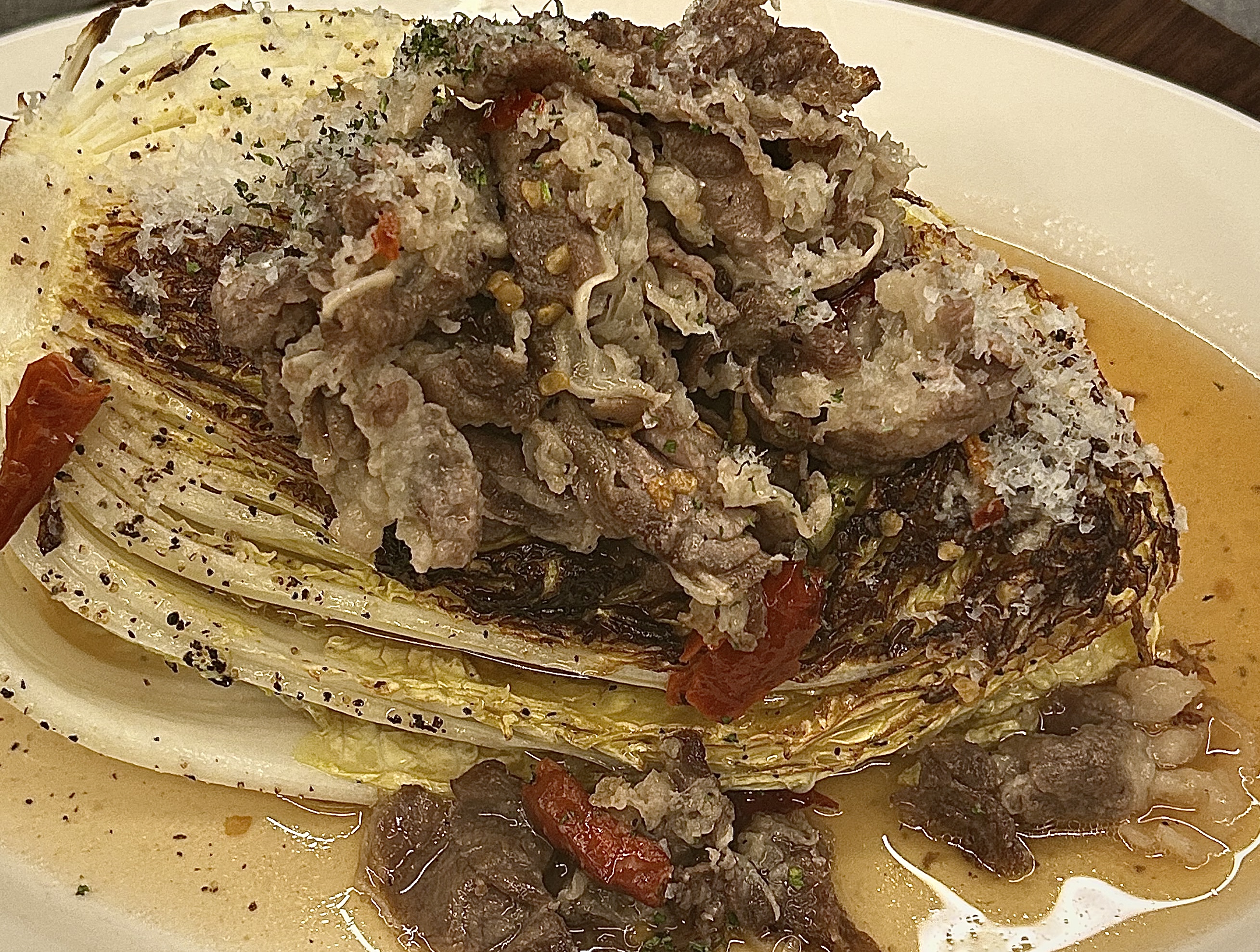 짧은설명 우삼겹과 일본식 소이 소스를 곁들인 스모키한 알배추 구이