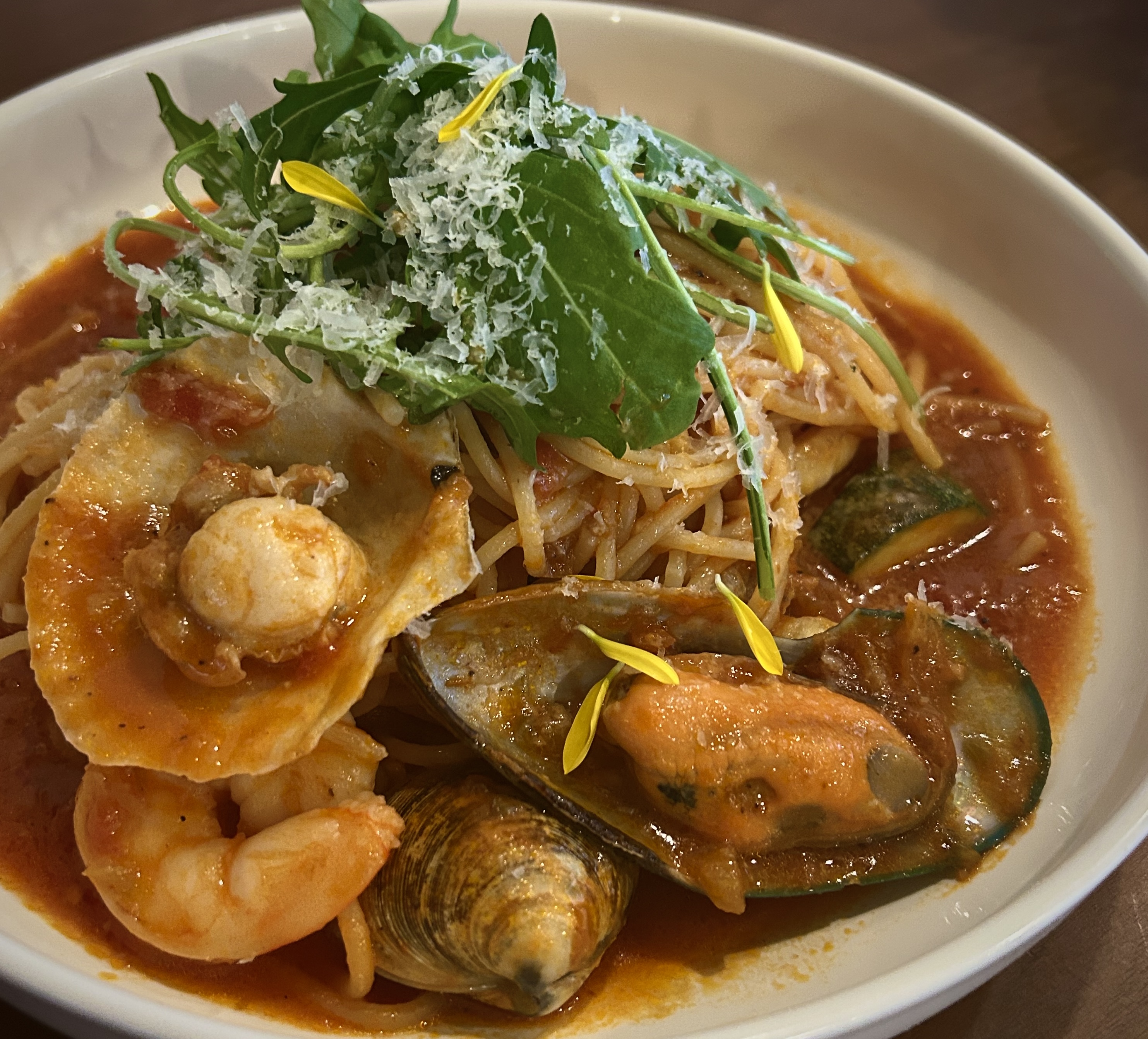 짧은설명 그린홍합, 가리비, 새우, 모시조개 등 신선한 해산물이 듬뿍 들어간 토마토 베이스의 파스타