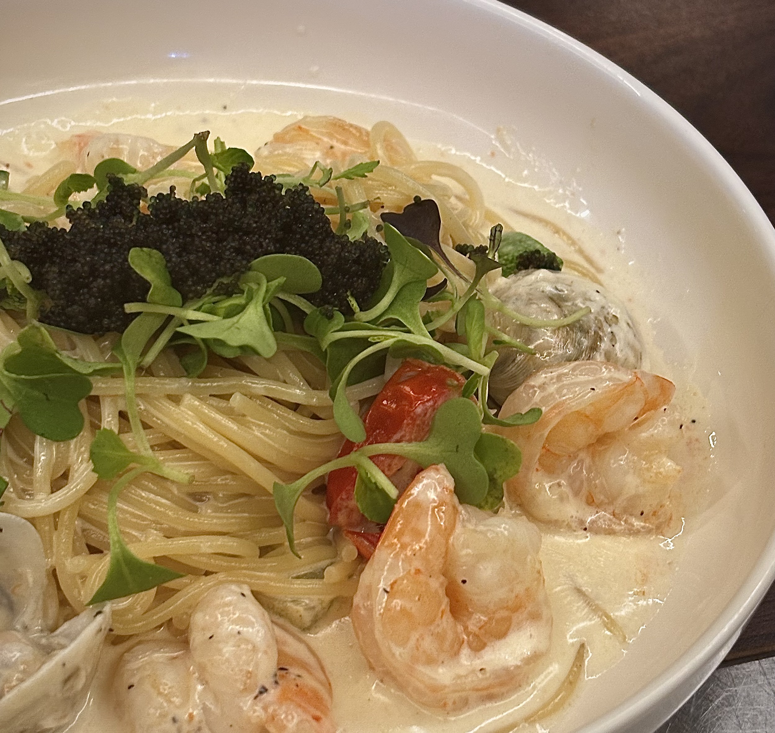 짧은설명 새우와 모시조개에 블랙 날치알을 얹어 부드러운 크림소스로 완성한 파스타