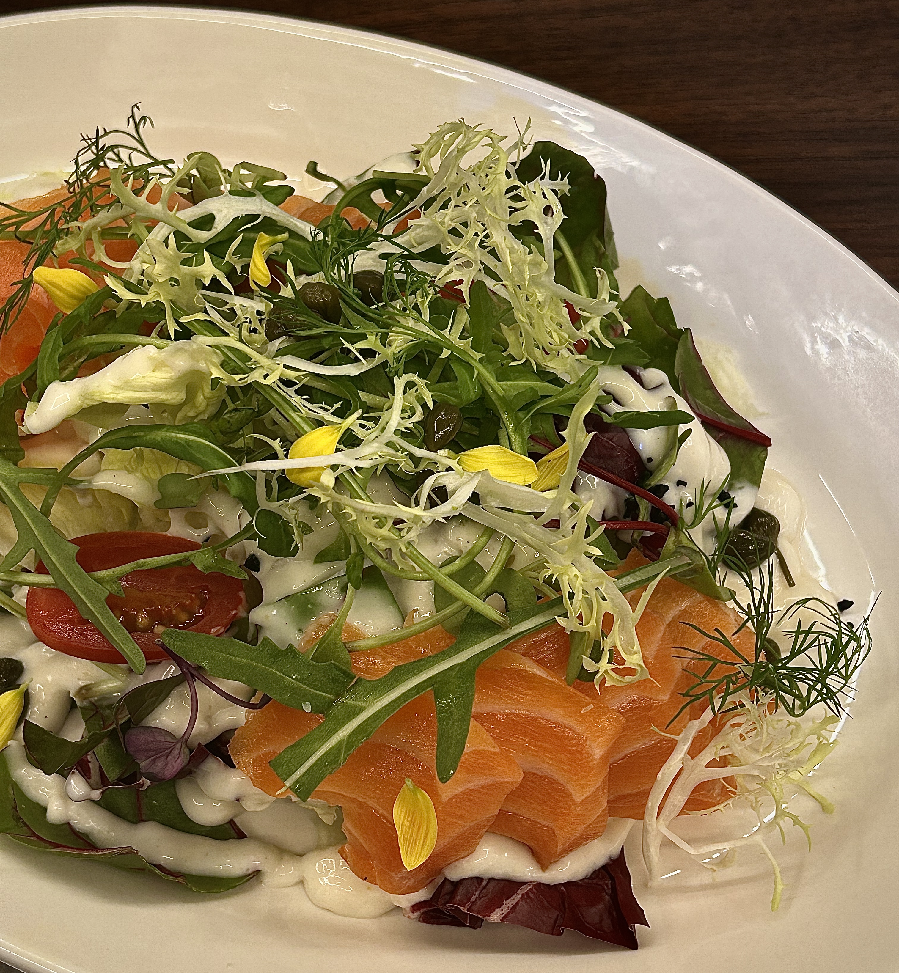 짧은설명 신선한 생연어와 신선한 채소를 홀스래디쉬 소스와 함께 곁들인 상큼한 샐러드